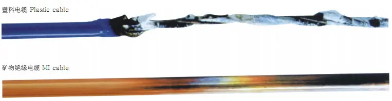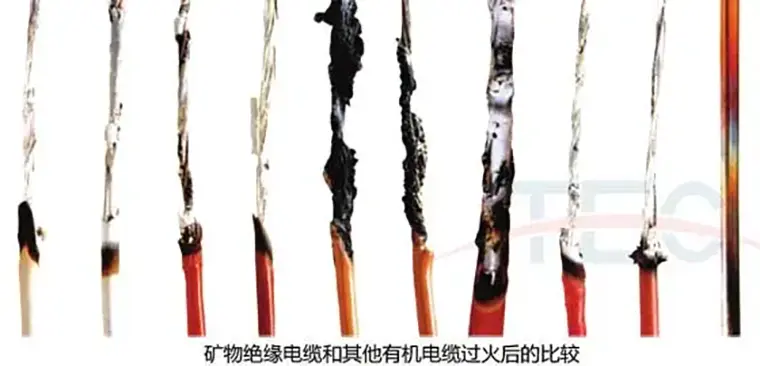 Mineralinės izoliacijos kabeliai po atsparumo ugniai bandymo beveik nepakito. Organinės izoliacijos kabeliai parodė akivaizdų karbonizaciją.
